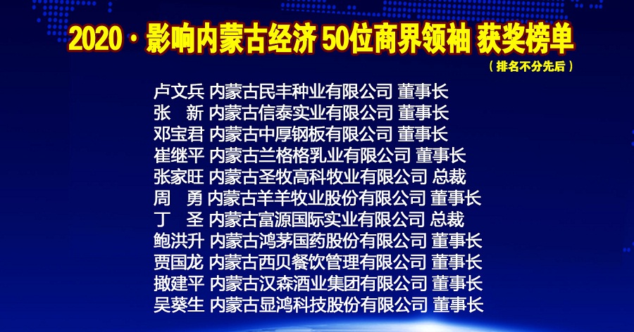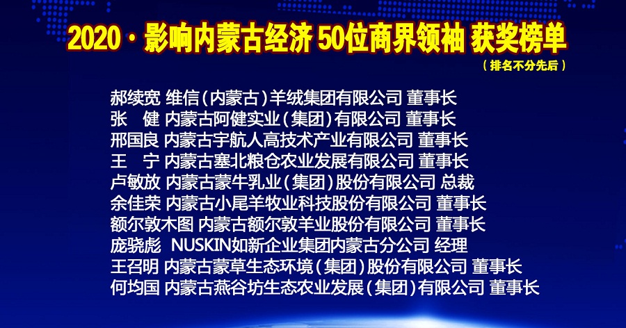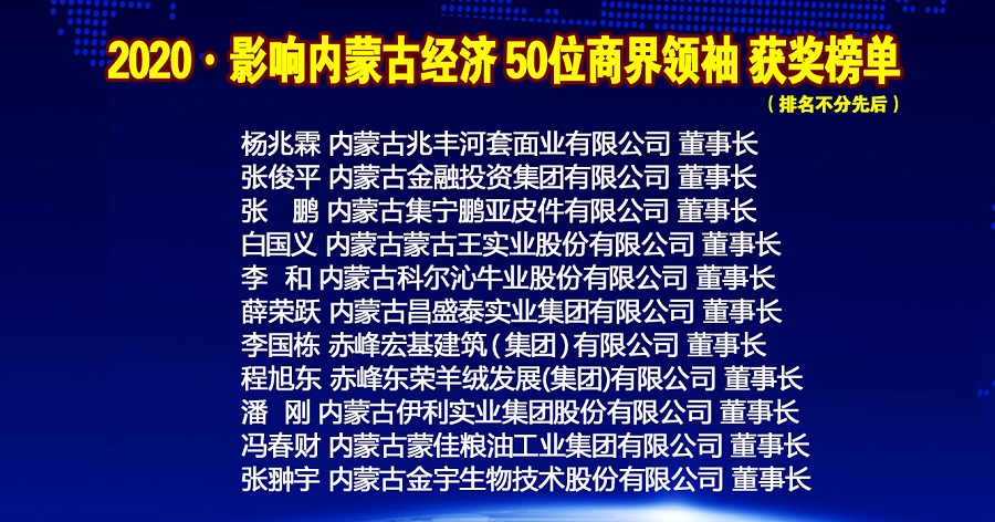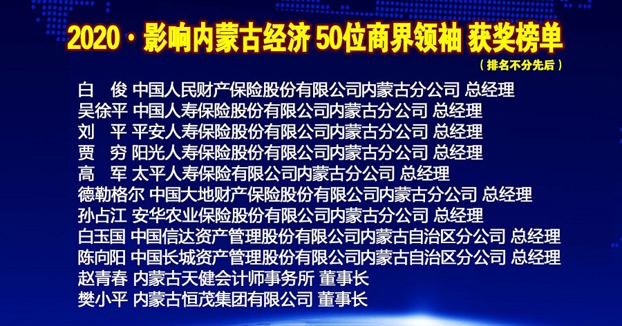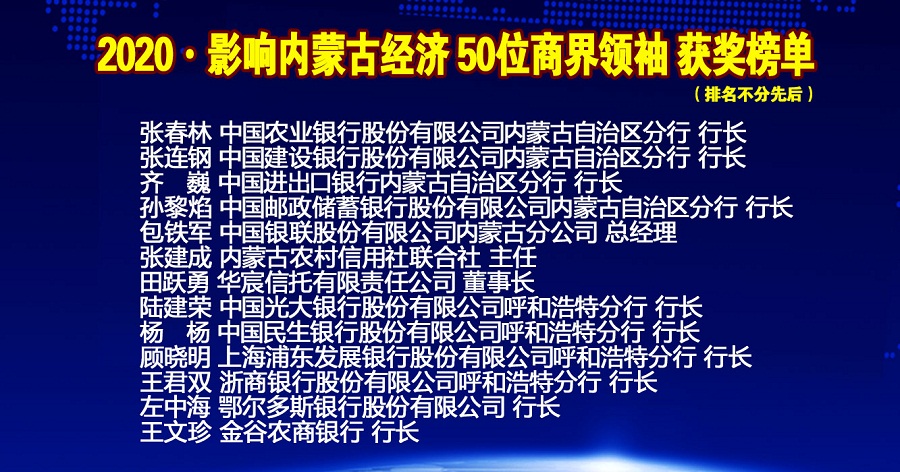 年會上內蒙古金融網(wǎng)、內蒙古新金融研究院隆重推出2020•影響內蒙古經(jīng)濟50位商界領袖榜單,從2015年度開始,每年按照項目發(fā)展,甄選出當年度引領商界風潮的50位內蒙古最具影響力的商界領袖。