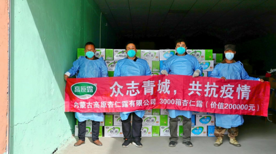 20、常務(wù)理事單位-內(nèi)蒙古高原杏仁露有限公司:近日,內(nèi)蒙古高原杏仁露有限公司向玉泉區(qū)捐贈(zèng)了價(jià)值12萬(wàn)余元的高原杏仁露,本次捐贈(zèng)表達(dá)了對(duì)所有抗疫工作人員的熱切關(guān)懷和暖暖情意,感謝所有逆行者“疫”無(wú)反顧的擔(dān)當(dāng)與堅(jiān)守。