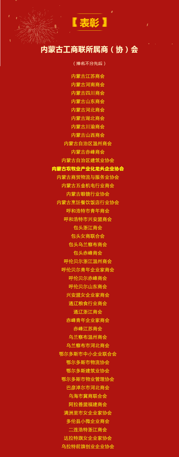 近日,中華全國工商業(yè)聯(lián)合會(huì)發(fā)布《關(guān)于認(rèn)定2023全國“四好”商會(huì)的通報(bào)》,通報(bào)指出,按照全國“四好”商會(huì)建設(shè)標(biāo)準(zhǔn),通過自下而上逐級(jí)推薦、省級(jí)工商聯(lián)審核把關(guān)和全國工商聯(lián)組織審定,認(rèn)定全聯(lián)1798家商會(huì)為2023年全國“四好”商會(huì)。其中內(nèi)蒙古自治區(qū)45家商(協(xié))會(huì)獲此殊榮,內(nèi)蒙古農(nóng)牧業(yè)產(chǎn)業(yè)化龍頭企業(yè)協(xié)會(huì)榜上有名!在此,謹(jǐn)向關(guān)心、支持協(xié)會(huì)的各位同仁表示衷心的感謝!同時(shí),對(duì)獲此殊榮的各兄弟商協(xié)會(huì)表示熱烈祝賀!