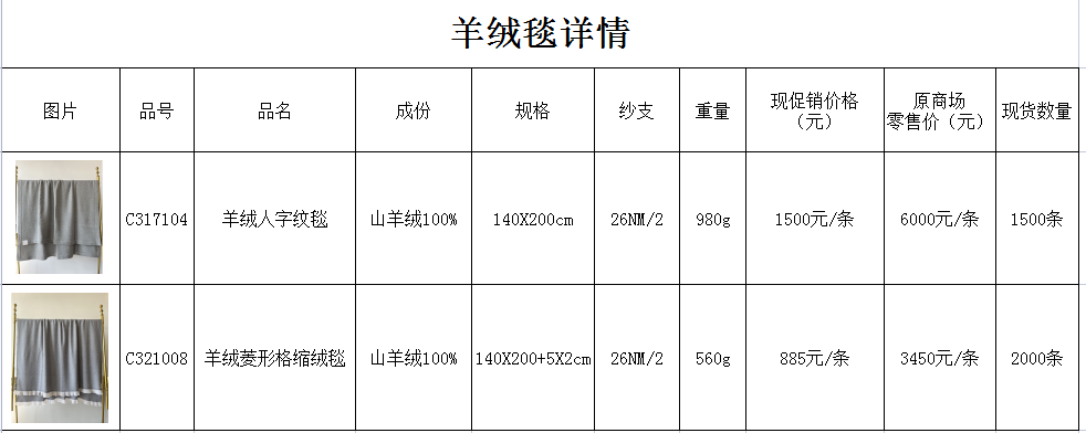 現(xiàn)有協(xié)會副會長單位內(nèi)蒙古大盛業(yè)羊絨制品有限公司生產(chǎn)的羊絨人字紋毯1500條,羊絨菱形格縮絨毯2000條,春節(jié)特價大酬賓,具體規(guī)格如下圖: