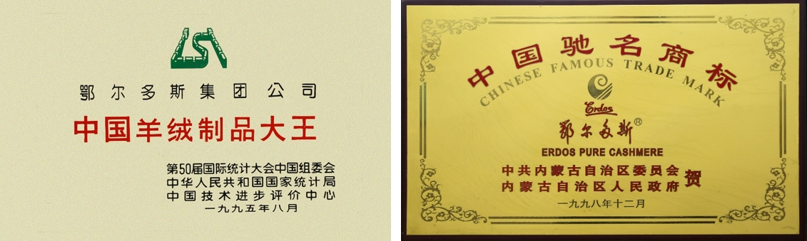 △左:1995年鄂爾多斯集團(tuán)榮獲“中國羊絨制品大王”稱號;右:1998年,鄂爾多斯品牌榮獲“中國馳名商標(biāo)”榮譽(yù)。