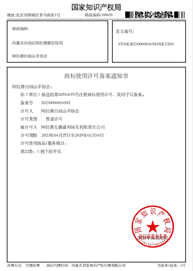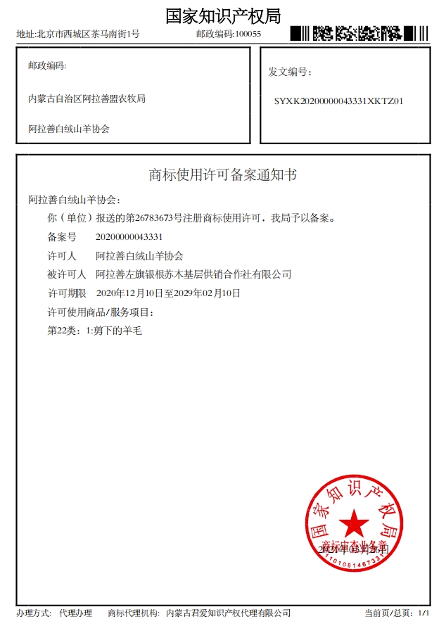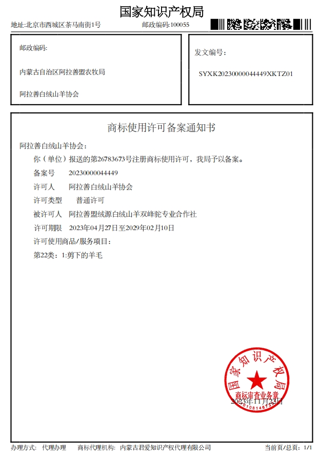 阿拉善白絨山羊協(xié)會已收到國家知識產(chǎn)權(quán)局下發(fā)的4項商標(biāo)使用許可備案通知書