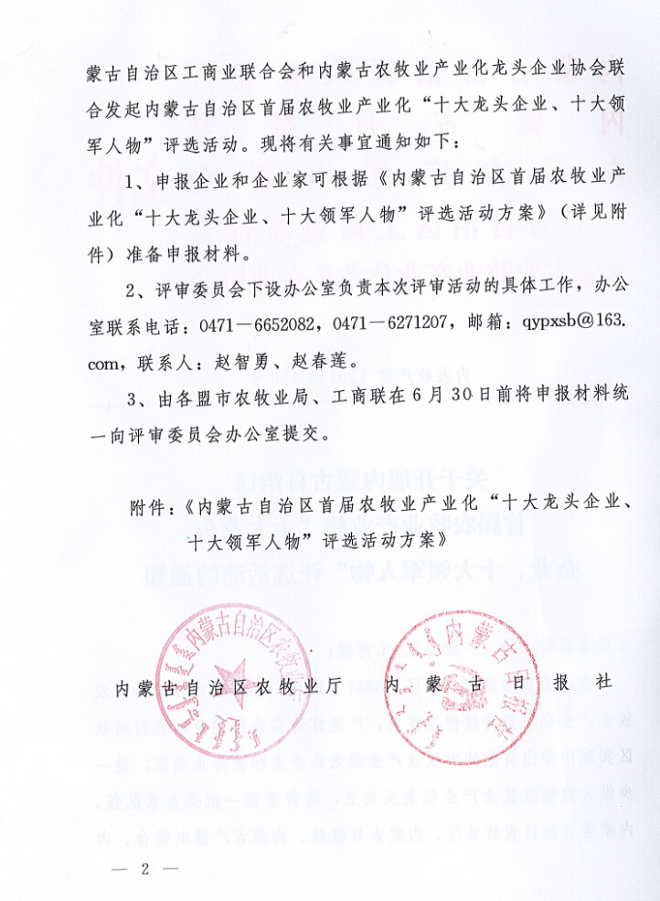 關(guān)于開展內(nèi)蒙古自治區(qū)首屆農(nóng)牧業(yè)產(chǎn)業(yè)化“十大龍頭企業(yè)、十大領(lǐng)軍人物”評選活動的通知