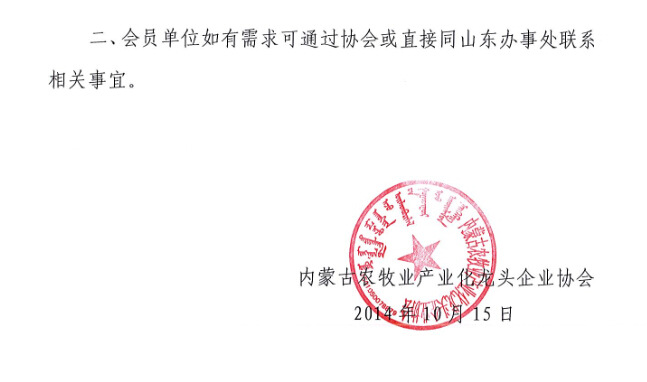 關(guān)于成立內(nèi)蒙古農(nóng)牧業(yè)產(chǎn)業(yè)化龍頭企業(yè)協(xié)會駐山東辦事處的通知