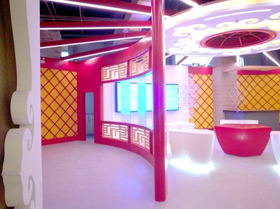 : 上海西郊國際內(nèi)蒙古館現(xiàn)場實景圖,現(xiàn)場分為展示區(qū)和體驗區(qū),展示區(qū)以產(chǎn)品展示銷售為主,現(xiàn)代科技結(jié)合時尚展廳設(shè)計風(fēng)格,藍(lán)綠白相結(jié)合,映襯藍(lán)天、白云、草原;體驗區(qū)突出體驗品嘗、商務(wù)洽談功能,以現(xiàn)代蒙古包造型設(shè)計,突出民族氣息,展現(xiàn)內(nèi)蒙古特色。