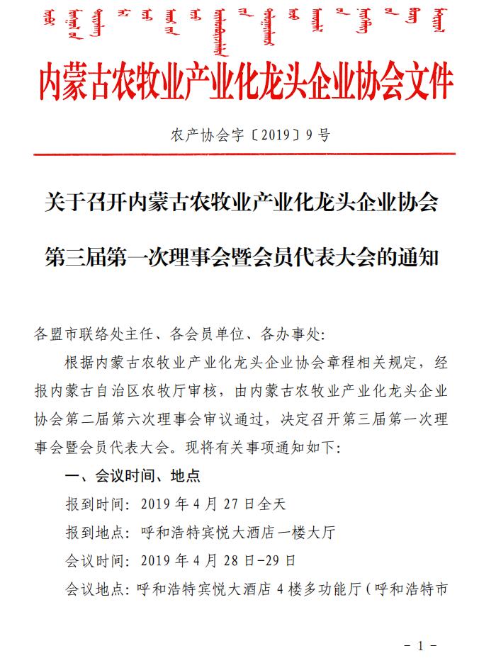 關(guān)于召開內(nèi)蒙古農(nóng)牧業(yè)產(chǎn)業(yè)化龍頭企業(yè)協(xié)會第三屆第一次理事會暨會員代表大會的通知