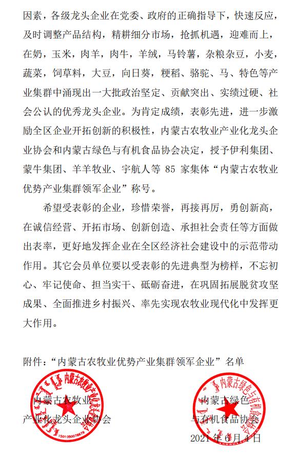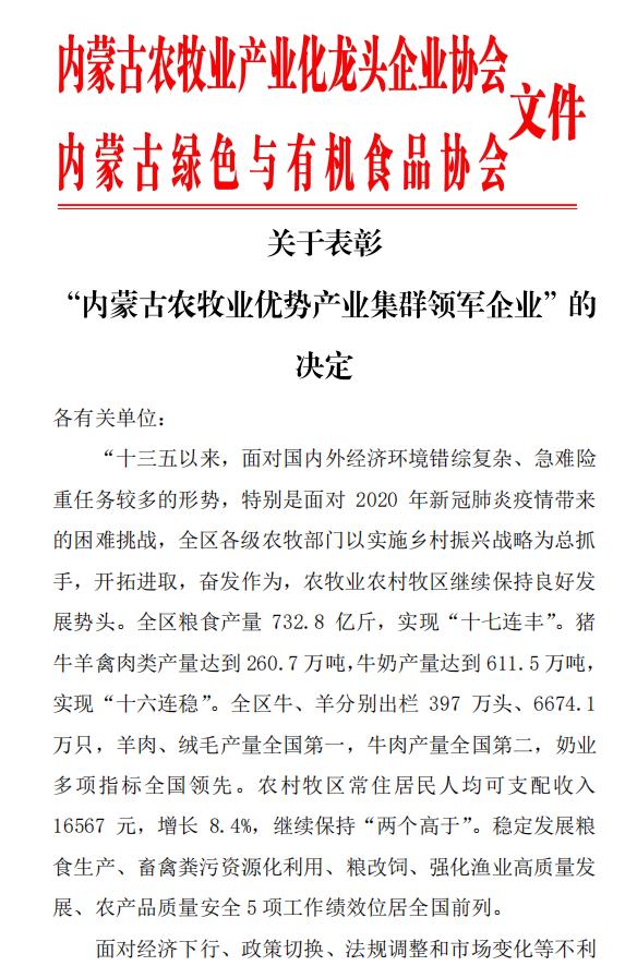 關于表彰“內蒙古農牧業(yè)優(yōu)勢產業(yè)集群領軍企業(yè)”的決定