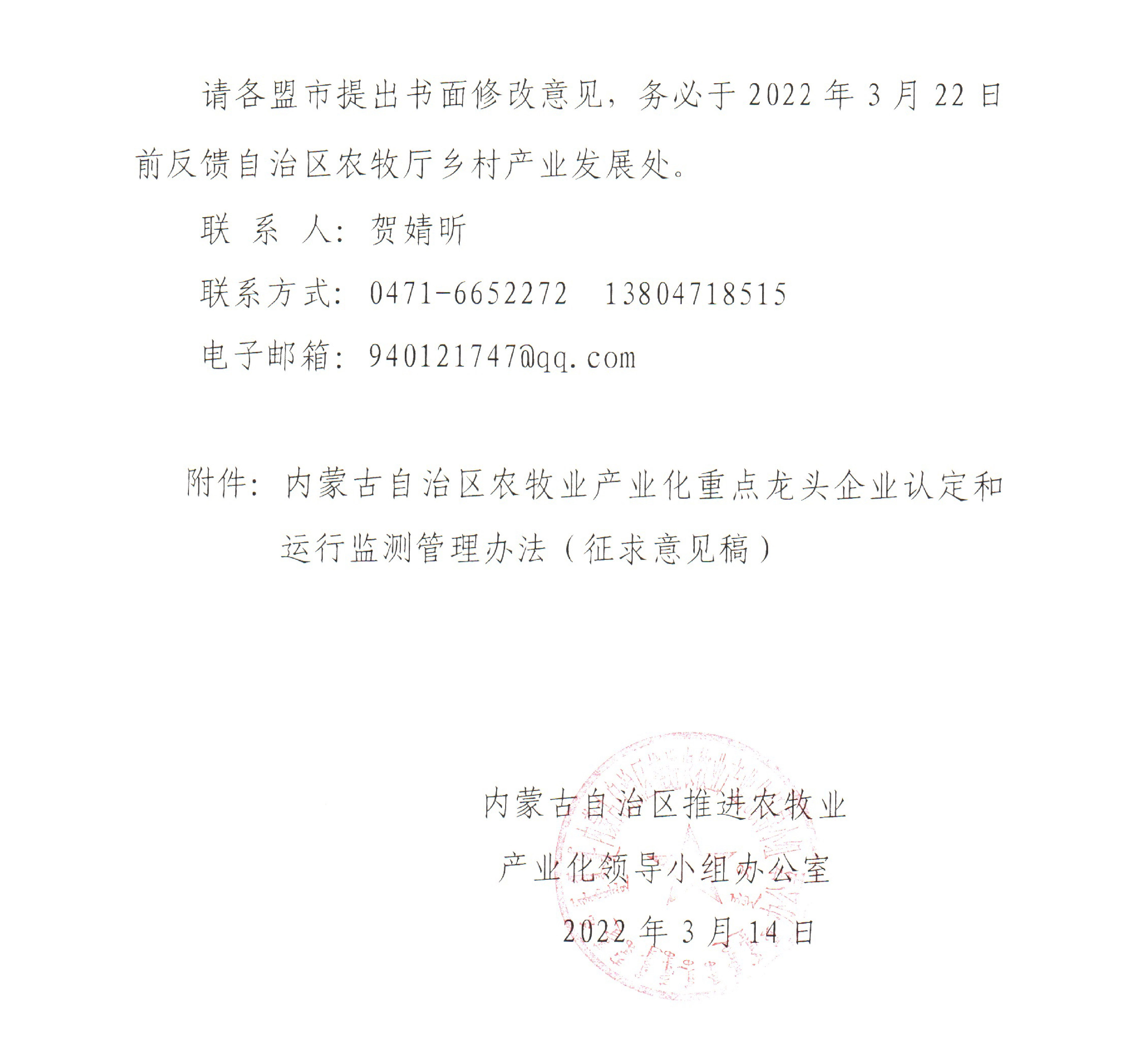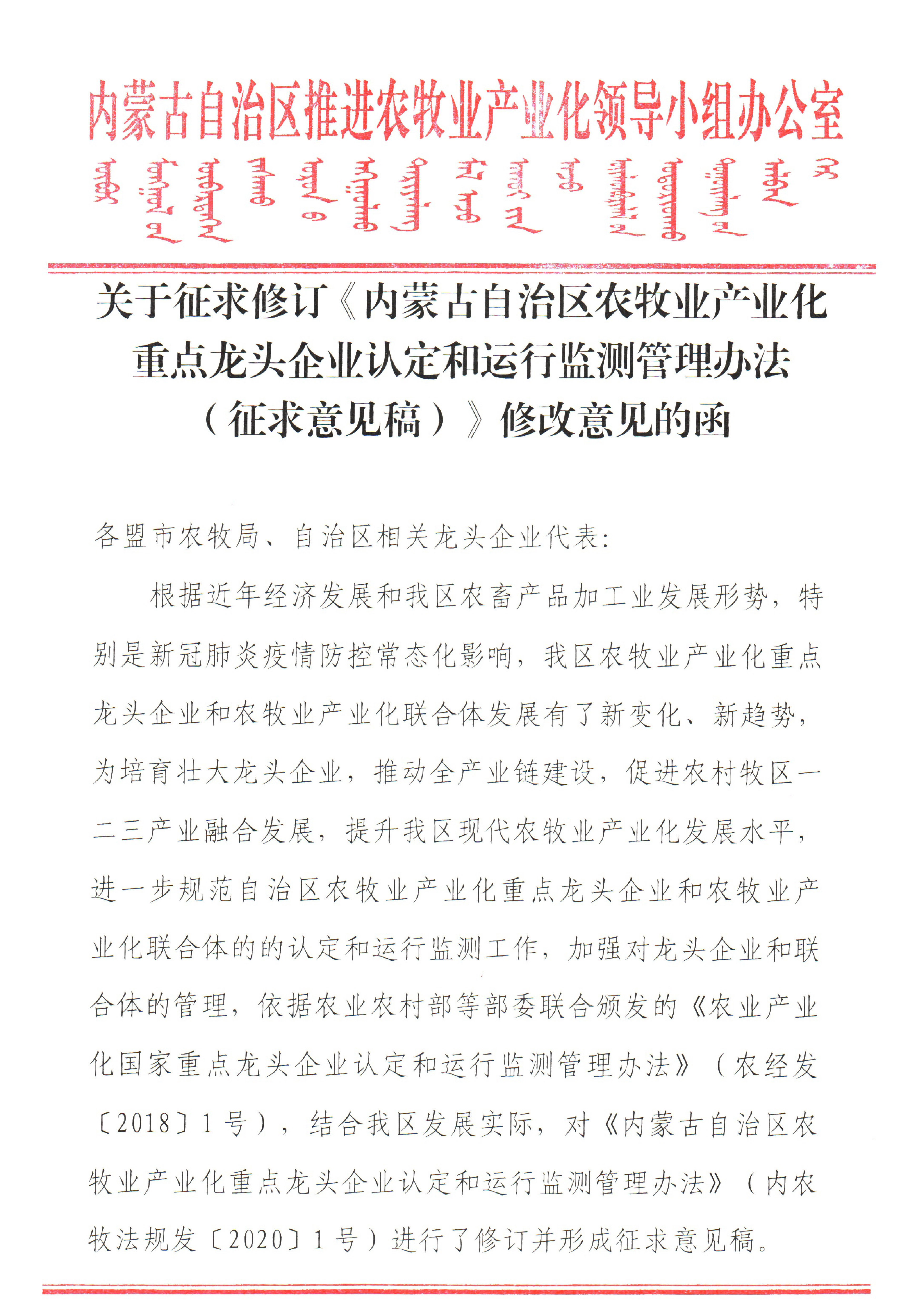 關于征求修訂《內(nèi)蒙古自治區(qū)農(nóng)牧業(yè)產(chǎn)業(yè)化重點龍頭企業(yè)認定和運行監(jiān)測管理辦法(征求意見稿)》修改意見的函