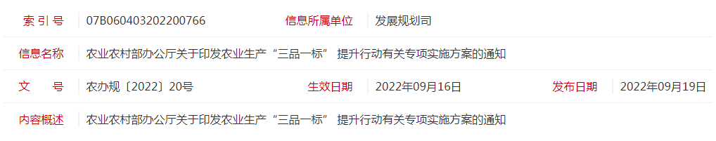 標題:農業(yè)農村部辦公廳關于印發(fā)農業(yè)生產(chǎn)“三品一標” 提升行動有關專項實施方案的通知