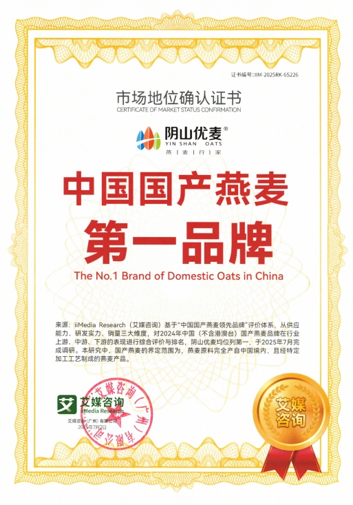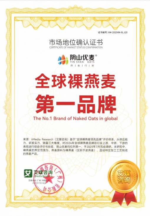 2025年7月,內(nèi)蒙古陰山優(yōu)麥食品有限公司獲得權威咨詢機構艾媒咨詢(iiMedia Research)頒發(fā)的“全球裸燕麥第一品牌”與“中國國產(chǎn)燕麥第一品牌”市場地位確認證書。同時,其創(chuàng)新產(chǎn)品“低GI五黑燕麥片”亦被權威認證為全球開創(chuàng)者,標志著陰山優(yōu)麥在全球燕麥行業(yè)取得突破性成果。